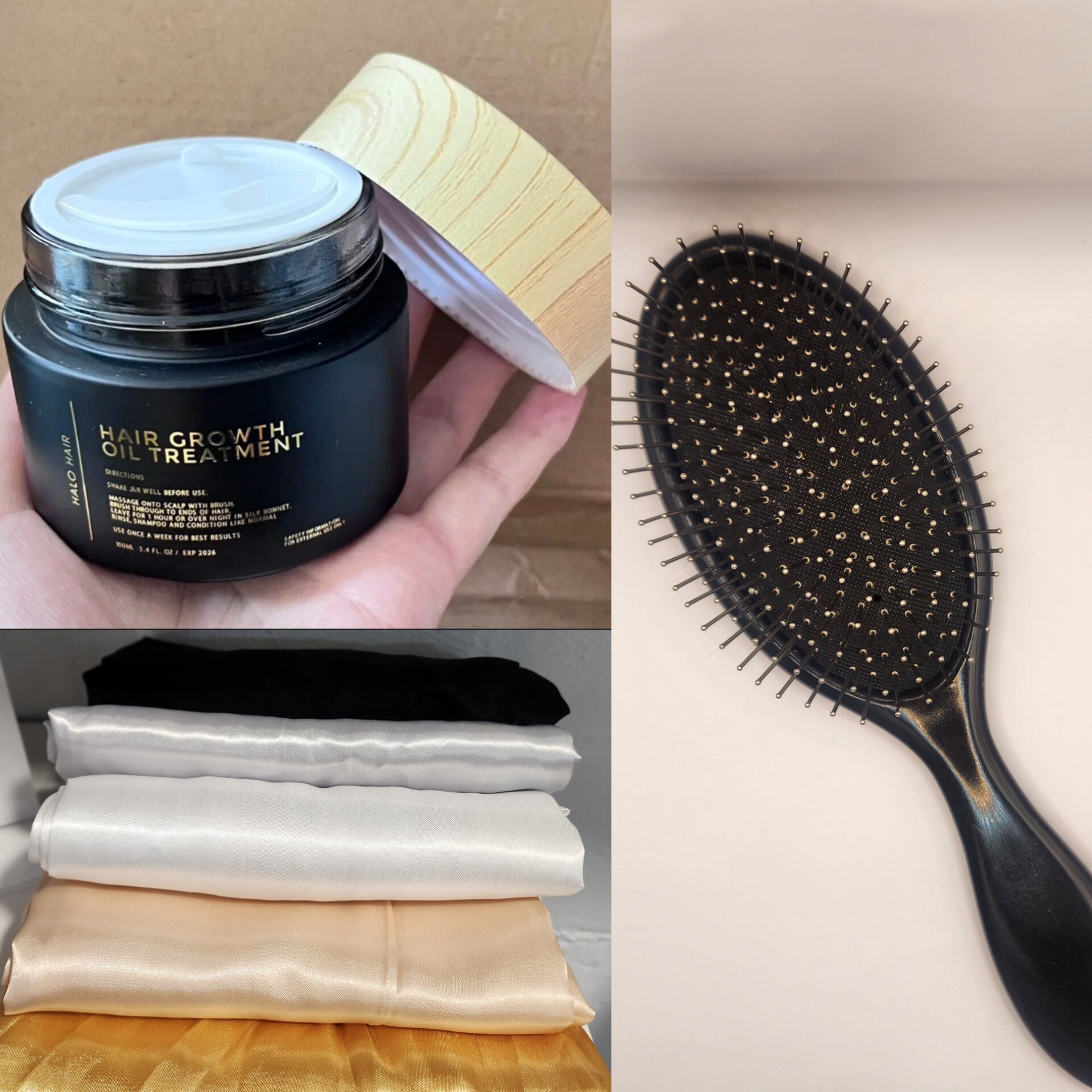 Hair Growth Oil Treatment, Growth Brush and Pillowcase of choice.